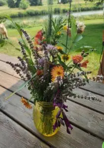Baked goods, canning, eggs, balms, lotions, soaps, stained glass art, teas, honey, flowers, fresh produce depending on what is in season at the time, and a drink and home-made burger combination with garden fresh fixings.